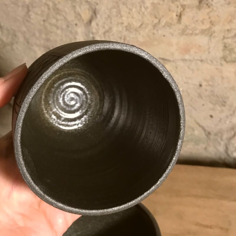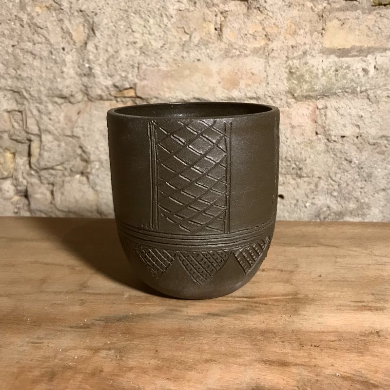 Unsere handgefertigte Nachbildung aus Steingut ist jetzt anders als die vorigen Versionen gearbeitet: Sie besteht aus hellem Ton, der dann mit Engobe-Technik dunkel überzogen ist, um das fertige Gefäß optisch an das ursprüngliche Original anzugleichen. Zudem wurden beim Drehen der Becher die Wände dicker gearbeitet, was die Robustheit verstärkt. Der Becher eignet sich zum Trinken für alle historischen - und modernen - Getränke.