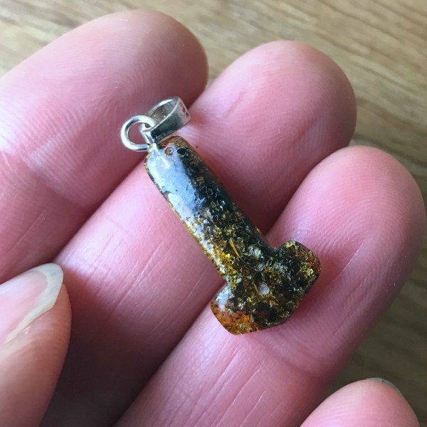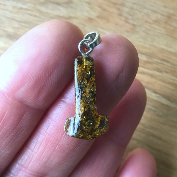 Kleiner Thorshammer aus echtem baltischen Bernstein in einem grün-goldenen, lricht glitzernden Farbton. Auf der einen Seite ist er unten etwas unsymmetrisch geschnitzt, was durch die ursprüngliche Oberfläche des verwendeten Bernsteins bedingt ist. Er hat eine feine, eingearbeitete Öse aus Silber. Dadurch lässt sich, im Gegensatz zu den gebohrten Bernsteinhämmern aus unserem Angebot, auch an einer feinen Silberkette und nicht nur am Lederband tragen. Die Öse ist für bis zu 2,8 mm starke Ketten geeignet.