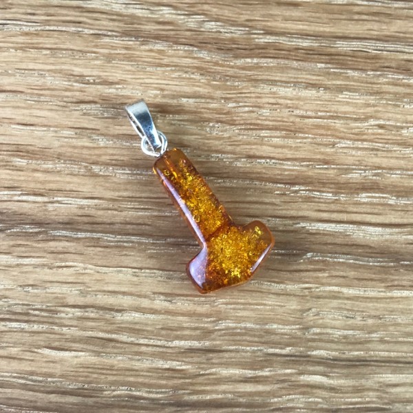 Kleiner Thorshammer aus echtem baltischen Bernstein mit leichtem Glitzern im Inneren. Er hat eine feine, eingearbeitete Öse aus Silber. Dadurch lässt sich, im Gegensatz zu den gebohrten Bernsteinhämmern aus unserem Angebot, auch an einer feinen Silberkette und nicht nur am Lederband tragen. Die Öse ist für bis zu 2,8 mm starke Ketten geeignet.