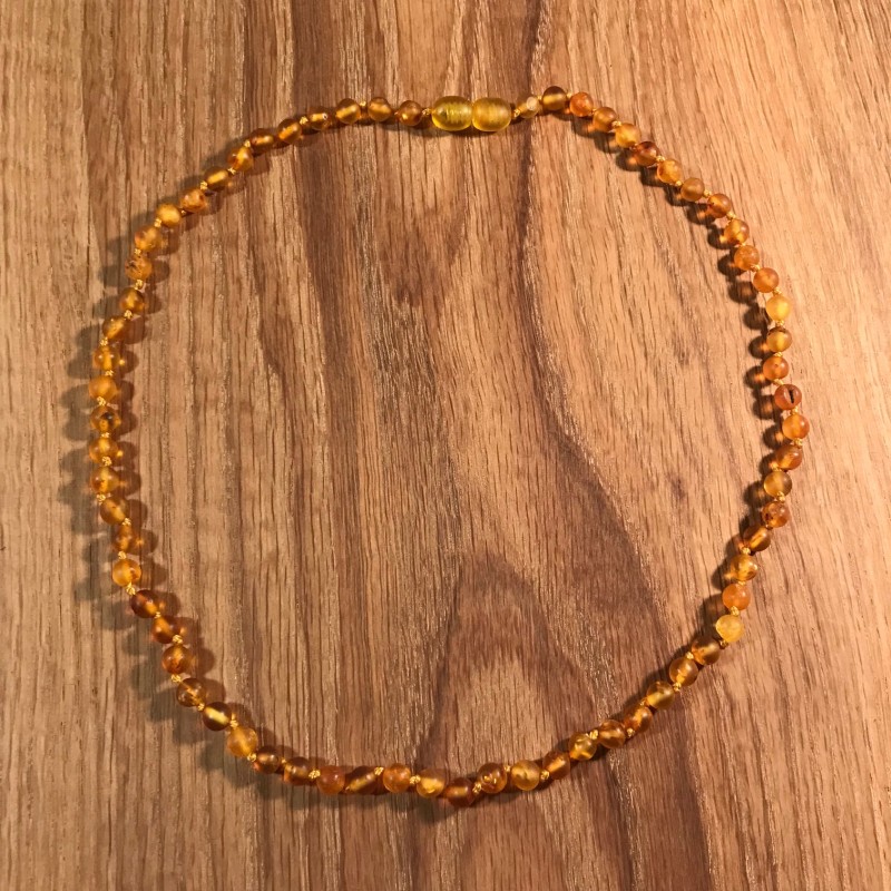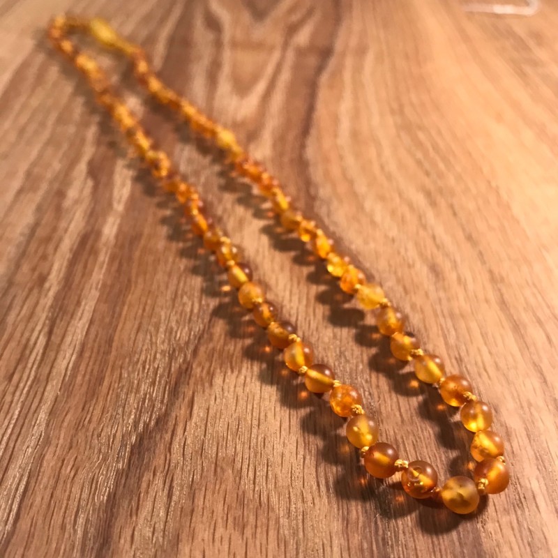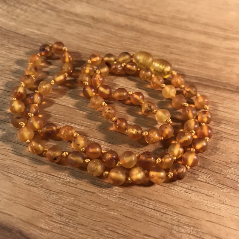 Für alle, denen naturbelassener Bernstein etwas zu grob vorkommt, ist diese Kette aus sorgfältig geschliffenen und nur leicht matt polierten ein Fund! Die Farbe der verwendeten Bernsteine ist wie heller, klarer Honig, aber die mattierte Oberfläche gibt den Oberflächen der Perlen einen besonderen und sanften Glanz. Die kleinen Perlen sind einzelnd auf das Band geknotet.