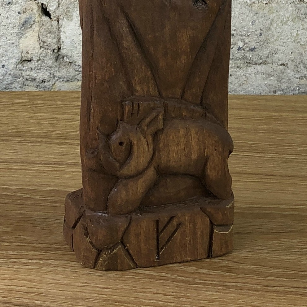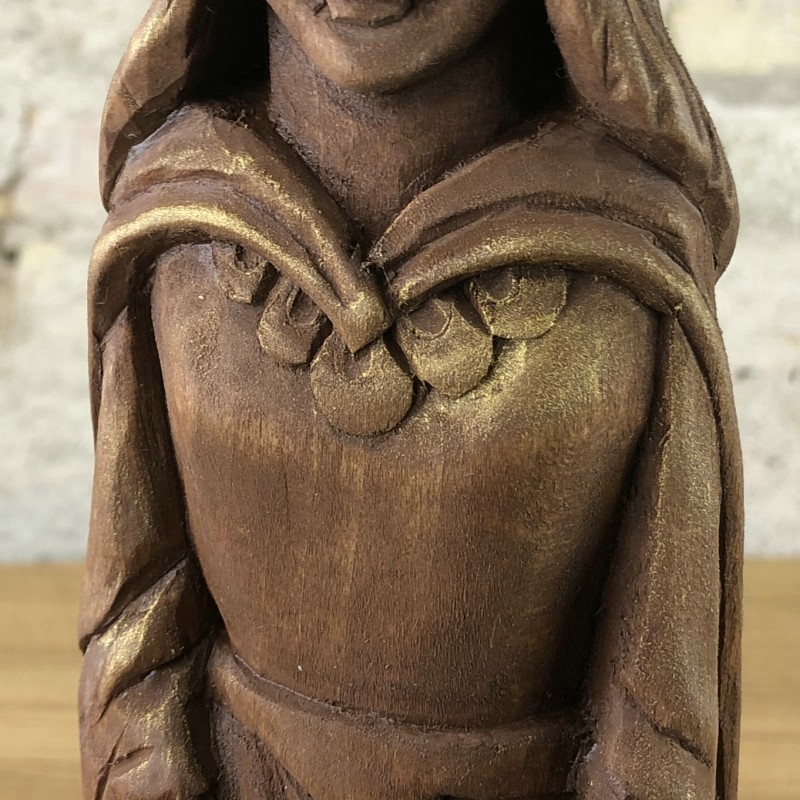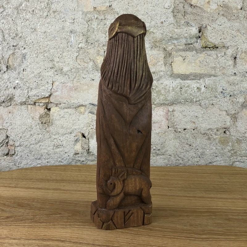 Diese handgefertigte Götterfigur aus Lindenholz zeigt die Göttin Freyja aus der nordischen Mythologie. Auf dem Kopf trägt diese Figur eine Art Kappe mit Flügeln nach wagnerischer Art, vielleicht sind diese Flügel auch Teil ihres Falkengewandes. Ihre Haare fallen über ein langen Schulterumhang, der Körper wird von einem verzierten Kleid bedeckt. Im Dekollete ist ihr Halsschmuck Brisingamen zu erahnen. Vorne schmiegt sich eine große Katze an, während sich auf der Rückseite ein wilder Eber befindet. Auf dem Sockel ist der Name Freya zu lesen. Diese Figur ist nur nur einmal vorhanden, die Bilder zeigen exakt dieses Unikat.