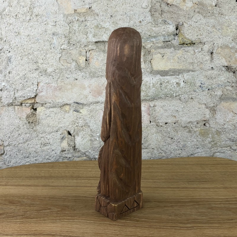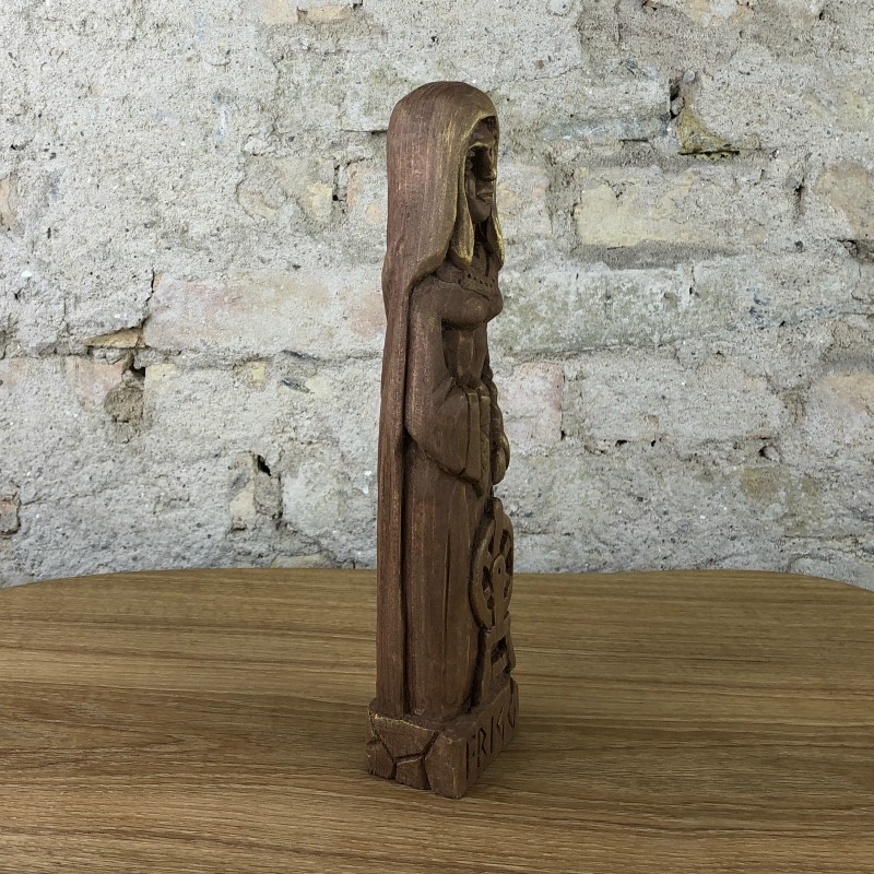 Diese handgefertigte Götterfigur aus Lindenholz zeigt die Göttin Frigg aus der nordischen Mythologie. Auf dem Kopf trägt diese Figur einen langen Umhang, der Körper wird von einem verzierten Kleid bedeckt. In der rechten Hand hält sie einen Spinnrocken und unter ihrer Linken steht ein Spinnrad. Auf dem Sockel ist der Name FRIGG zu lesen. Diese Figur ist nur nur einmal vorhanden, die Bilder zeigen exakt dieses Unikat.