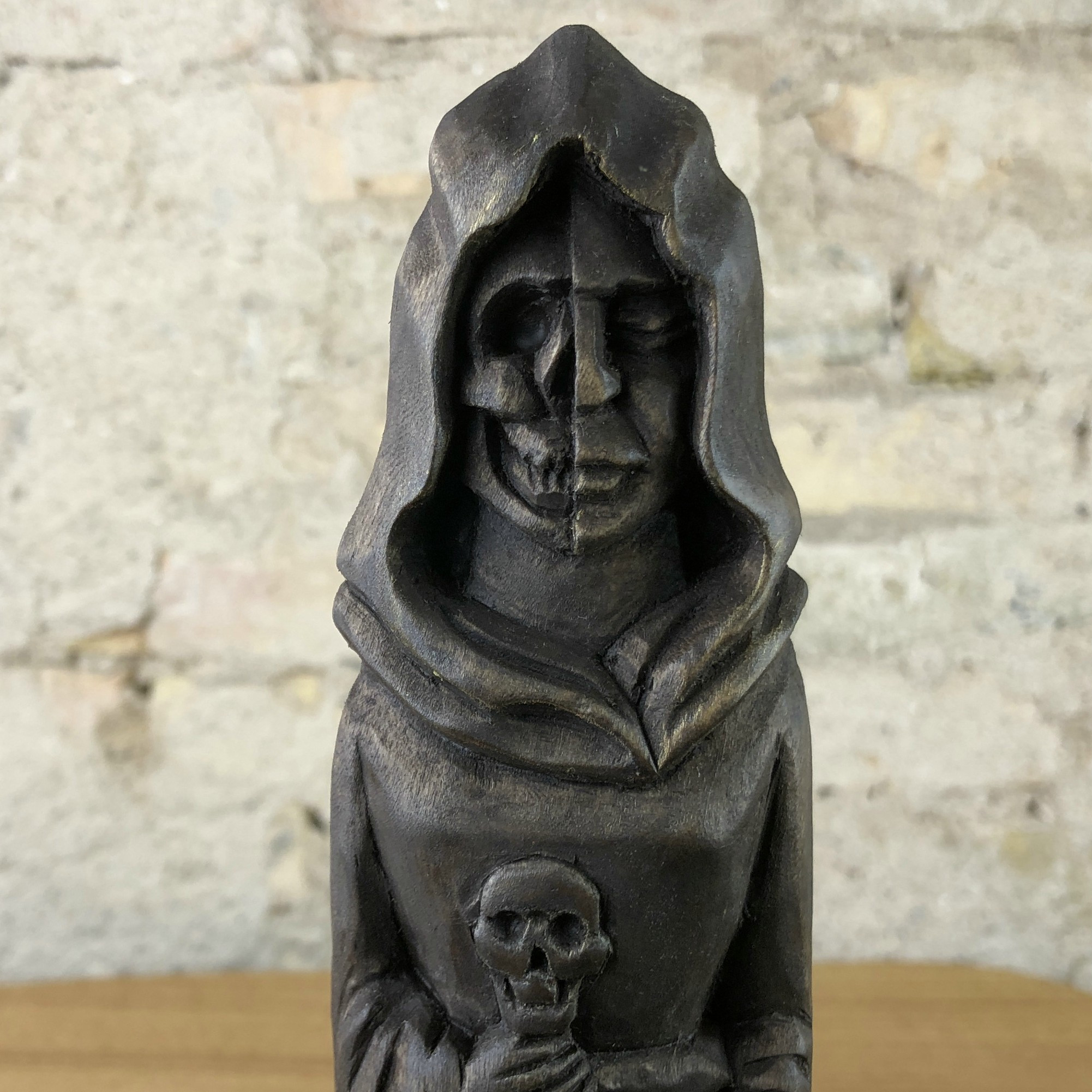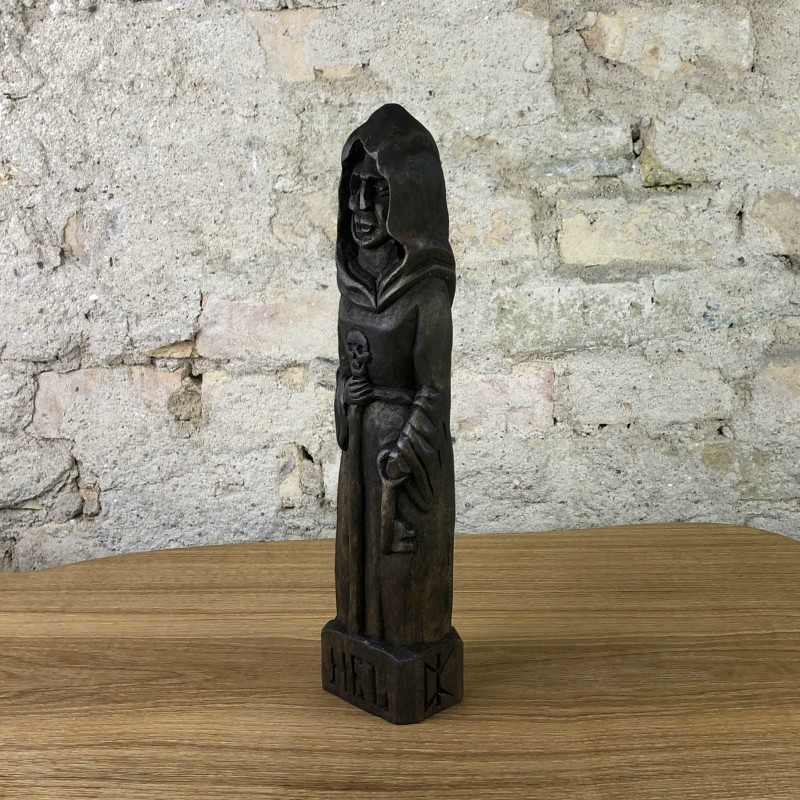 Diese handgefertigte Götterfigur aus Lindenholz zeigt die Göttin Hel aus der nordischen Mythologie. Auf dem Kopf trägt sie einen Umhang, das Gesicht ist geteilt in zwei Hälften, welche den Tod und das Leben symbolisieren. In der rechten Hand hält sie einen Stab mit einem Totenschädel im Griffbereich, in der linken Hand trägst sie einen Schlüssel. Im Sockel ist der Schriftzug HEL zu sehen.
