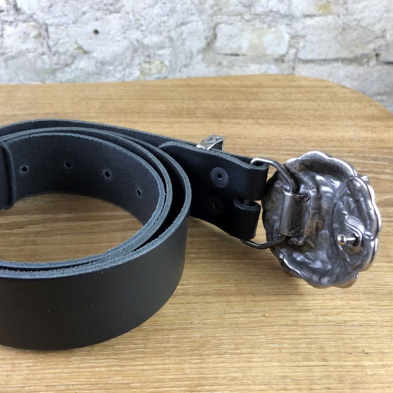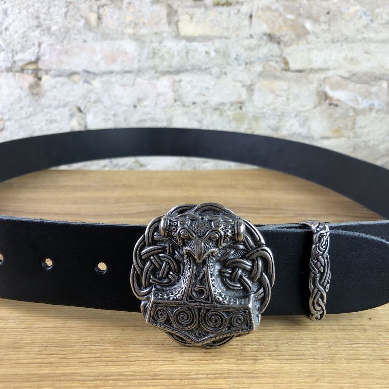 Gürtel aus echtem Leder mit Buckle in Form eines Thorshammer. Der Mjöllnir Verschluss wurde dem Thorshammer Amulett aus Skane / Südschweden nachempfunden. Mit seiner Lederbreite von ca. 4 cm passt er in die Schlaufen klassischer Jeans und ist somit ein modernes Accessoir mit historischer Symbolik für den Alltag jedes Lifestyle-Wikingers.