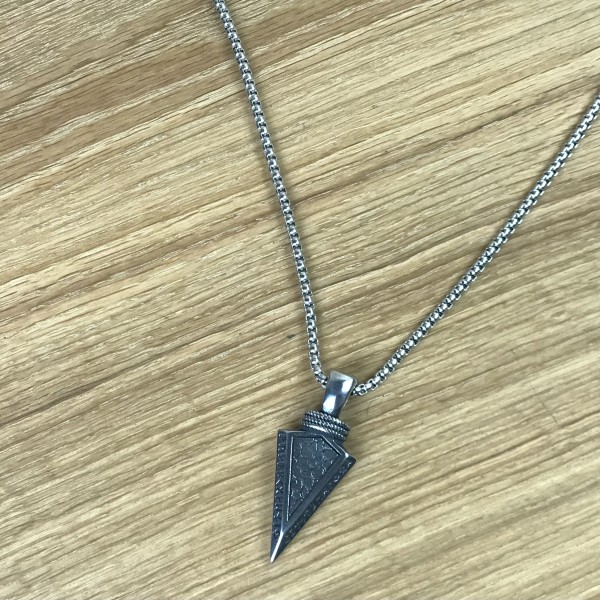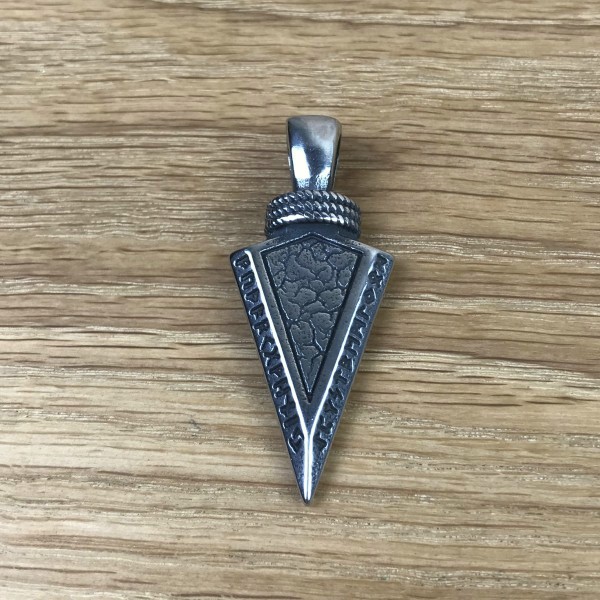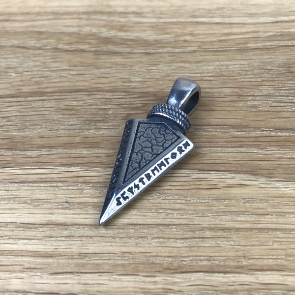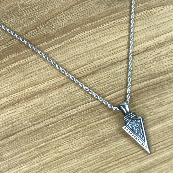 Beidseitig gestaltetes Amulett mit großer Öse zur Aufhängung an Kette oder Band. Auf den Kanten der Speerspitze ist die komplette Runenreihe des sogenannten "Älteren Futharks" aufgeführt. Die letzten beiden Runen (Dagaz und Othala) sind vertauscht, was vereinzelt auch bei historischen Runenreihen zu finden ist.