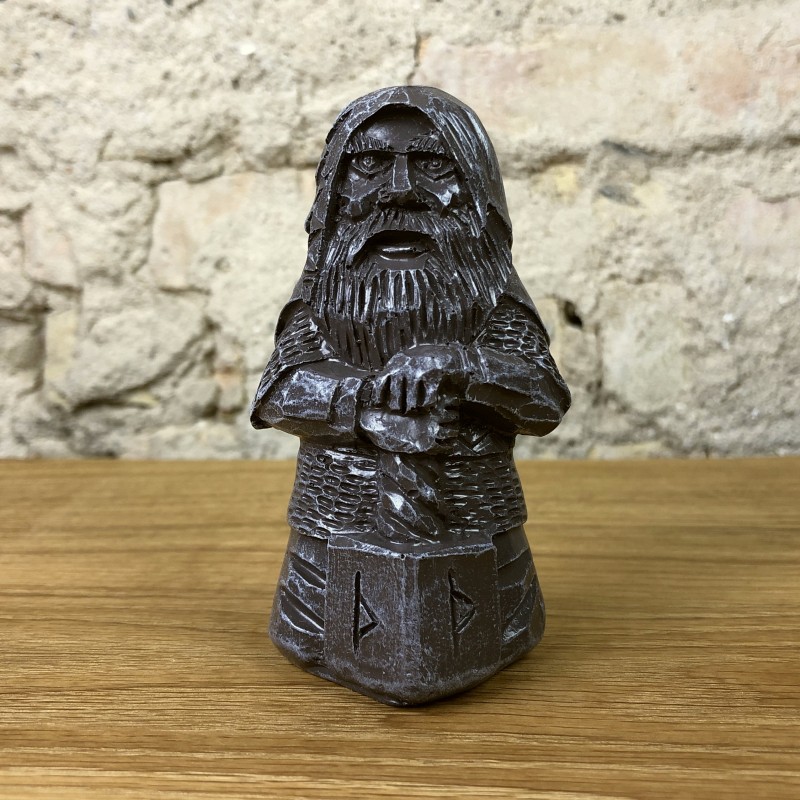 Thor Figur aus Polystone. Die Darstellung zeigt einen bärtigen Mann mit Umhang und Kaputze. Auf dem Boden vor ihm steht sein mächtiger Hammer, welchen er mit beiden Händen hält. Der Hammer zeigt auf zwei Seiten die Rune "Thurisatz".