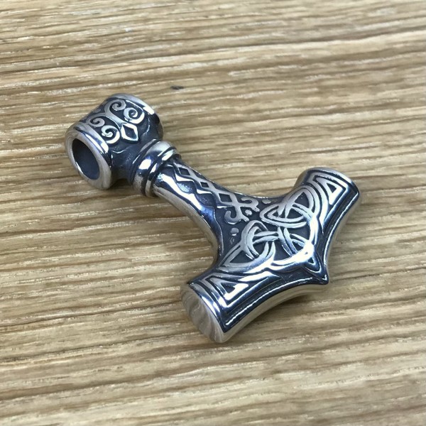 Dieser moderne Thorshammer zeigt sich formschön und mit einer Verzierung, die deutlich und nicht überfrachtet ist. Unten auf dem Hammerkopf erinnert die lose-geschwungene, doppelbändige Linienführung an den wikingerzeitlichen Mammenstil. Dieser Anhänger ist beidseitig gearbeitet.