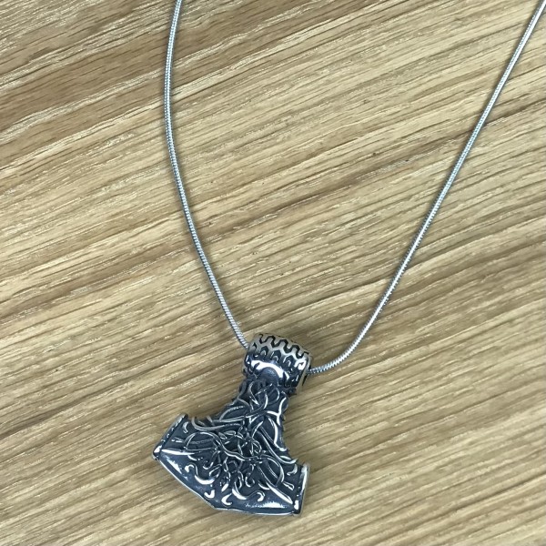 Ein breites, aber eher flaches Thorshammer-Amulett, das auf der beidseitigen Oberfläche eine Verzierung trägt, die wie dichtes und verflochtenes Wurzelwerk aussieht. Dieses Wurzelgeflecht kann Symbol für Zusammenhalt und Verbundenheit sowie für Wachstum und Natur sein, kann diesen Thorshammer außerdem auch mit Verbindung zur Welt der Zwerge, der Landwichte und zu den "Unnererschen" (Unterirdischen) kennzeichnen.
