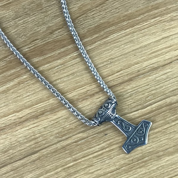 Moderne Variante eines zweiseitig gearbeiteten Mjöllnir. Durch die Gestaltung von Kopf und der auf den Oberflächen verwendeten Mustern erinnert er entfernt an den berühmten Schonenhammer. Durch den Kopfteil, dessen Ösenöffnung ca. 5 mm beträgt, lassen sich sowohl stabile Lederbänder wie auch Edelstahlketten durchführen. Der untere Teil ist flach gearbeitet und hat die für den Schonenhammer typischen Wellemuster.