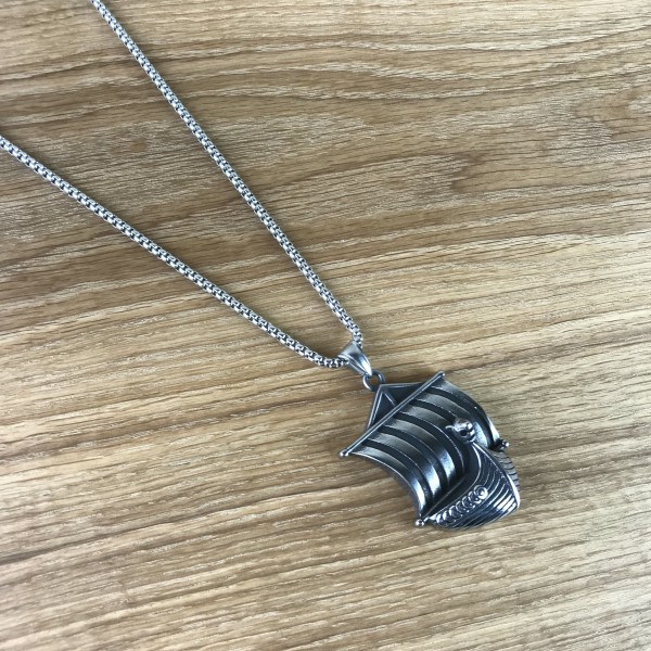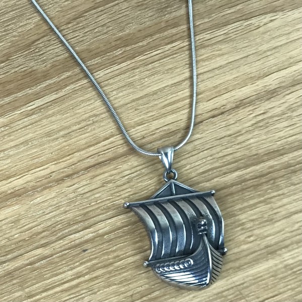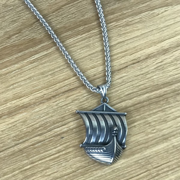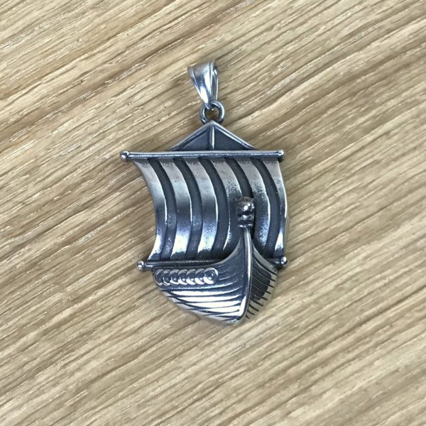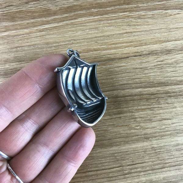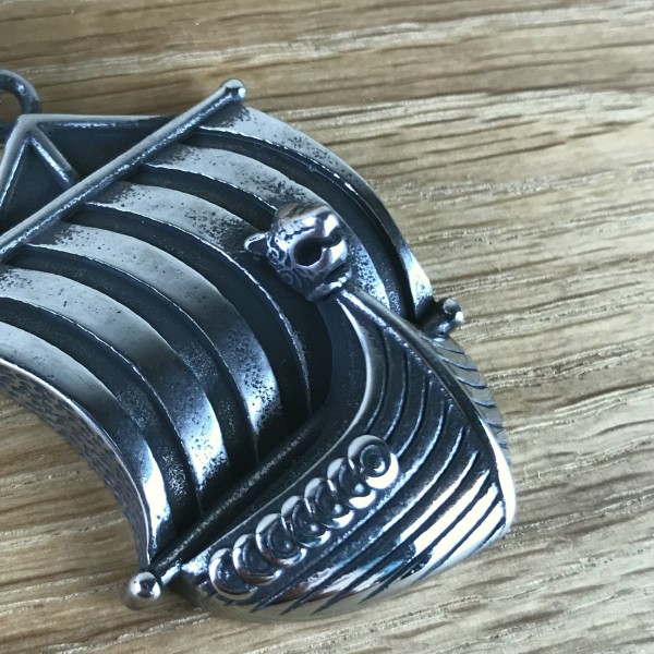 Wikingerschiff mit Drachenkopf und Wind von achtern im gestreiften Segel als großer Anhänger. An der Reling sind Rundschilde aufgereiht, der Drachenkopf ist als kleines, feines Detail sogar mit Mustern verziert.
